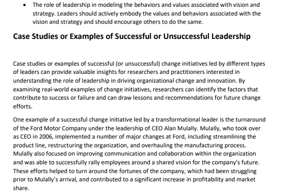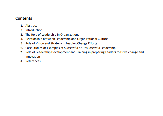 Leadership plays a critical role in driving organizational change and innovation. Effective leaders are able to identify opportunities for change and create a vision for the future, inspiring and motivating others to work towards achieving that vision. In this research paper, we explore the various ways in which leadership can influence organizational change and innovation, including setting a clear direction, communicating effectively, and building a culture that encourages creativity and risk-taking. We also examine the challenges that leaders may face in leading change and innovation and discuss strategies for overcoming those challenges. Based on a review of relevant literature and case studies, we conclude that leadership is a key factor in driving organizational change and innovation and that effective leadership can lead to improved performance and outcomes for organizations.